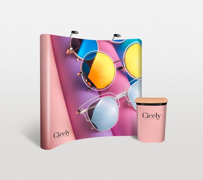 The aluminium frame snaps together in no time, and the custom printed graphic panels are easy to apply using magnetic strips. The wheeled case even doubles as a podium, with its own graphics and wooden countertop.